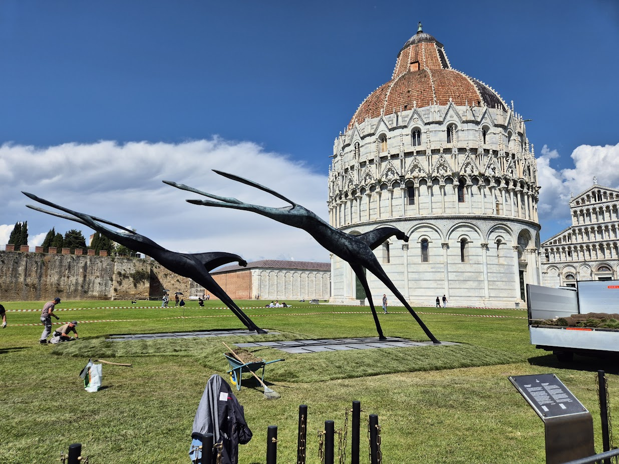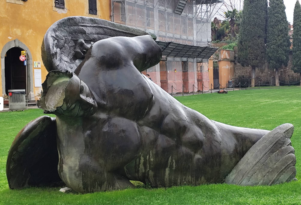 본격적으로 피사를 구경합니다. 왼쪽 위 둥근 건물은 산 지오바니 세례당입니다. 인부들이 공사하는 걸로 봐서 날렵한 사냥개 동상은 최근 설치되는 듯 했습니다. 피사의 사탑을 밀어올리는 사진도 찍고, 머리가 없는 타락한 천사(Angelo Caduto)도 만났습니다.