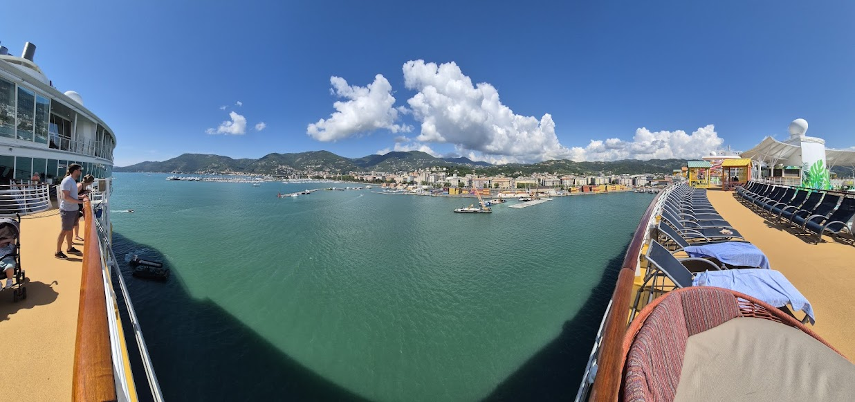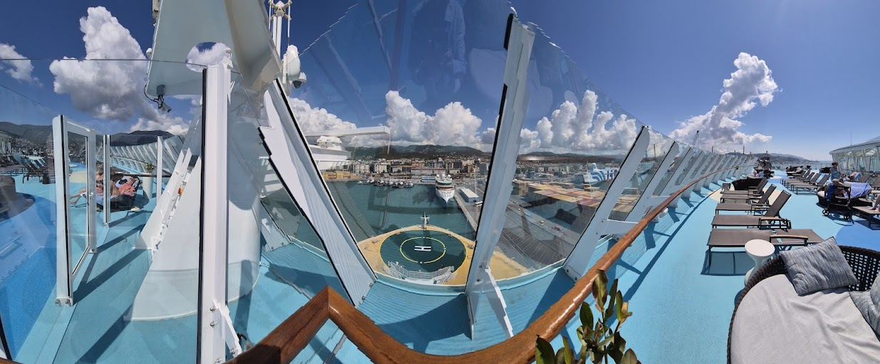 피사로 출발하는 시간이 2시 정도였습니다. 그래서 비는 오전 동안 여기저기 기웃거렸습니다. 그러다가 배 맨 앞쪽에 가보면 좋겠다고 생각했습니다. 아래는 15층 제일 앞쪽에서 촬영한 파노라마입니다. 가운데 헬리콥터 착륙장이 있는 곳이 뱃머리입니다.