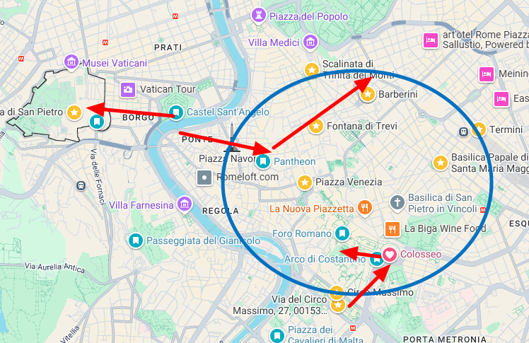 대략 동선은 아래와 같습니다. 선택관광 버스가 데려다 준 곳은 맨 아래쪽 막시무스 광장이고, 거기서 걸어서 콜로세움까지 이동한 후, 포름포마노를 통과하려다 실패해서 다시 콜로세움으로 돌아와 버스를 타고 산 안젤로 다리까지 가서 바티칸을 다녀온 후, 트레비 분수를 거쳐 버스를 타고 귀환했습니다. 파란색 원은 대략적인 Hop on and hop off 버스 노선입니다.