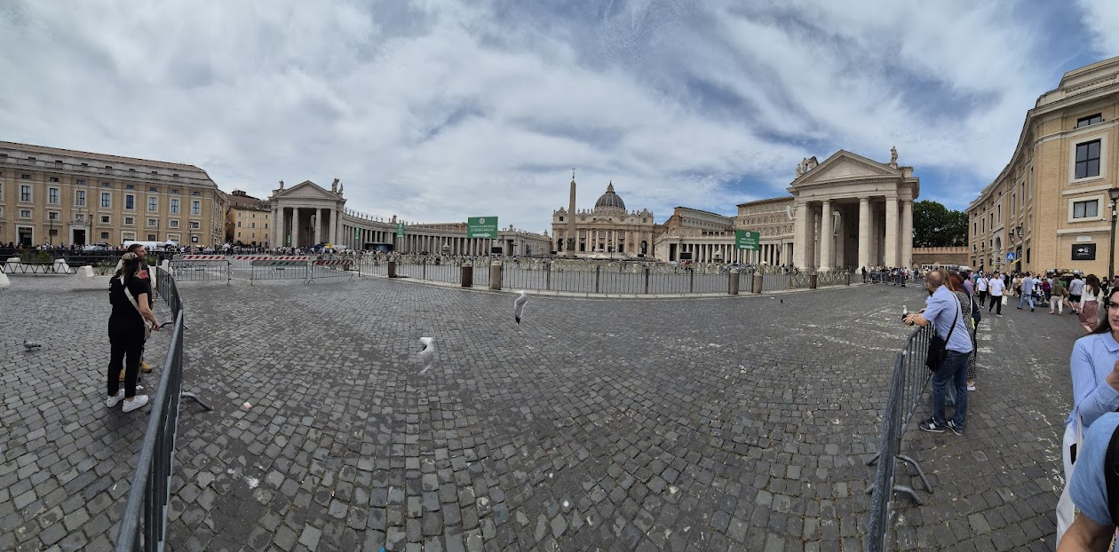 바티칸 광장 파노라마 사진입니다. 텅 비어 있는 것처럼 보이시겠지만, 새로 선출된 교황님의 첫 야외 미사가 며칠 후 열릴 예정이라 철제 칸막이로 막아두고 철저하게 출입을 통제하고 있어서입니다.
