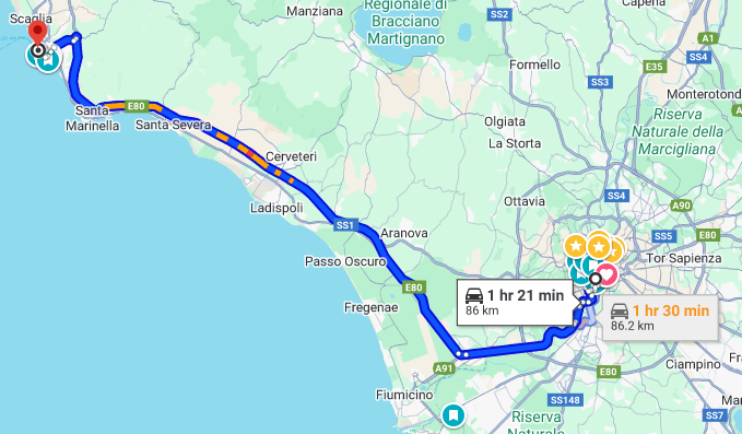 5월 15일, 12일차입니다. 크루즈는 치비타베키아 항에 기항했습니다. 우리 목적지는 로마인데, 치비타베키아에서 로마까지는 86km 떨어져 있네요. 거리상으로는 라스페치아-피사와 별로 차이가 나지 않는데, 차를 타는 시간은 거의 2배가 걸렸습니다.