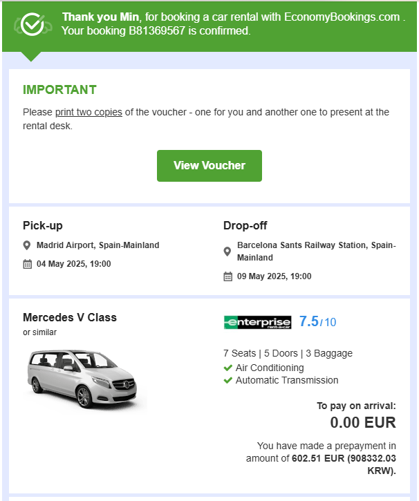 다만, 도착한 시간이 9시 10분. 스페인이 썸머타임을 한다는 걸 알고 시간이 충분하다고 생각했는데 렌트카 찾느라 시간을 너무 보내서 늦는 바람에 좀 허둥거렸네요.