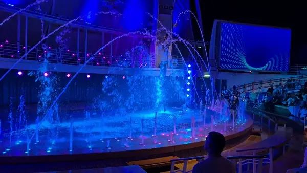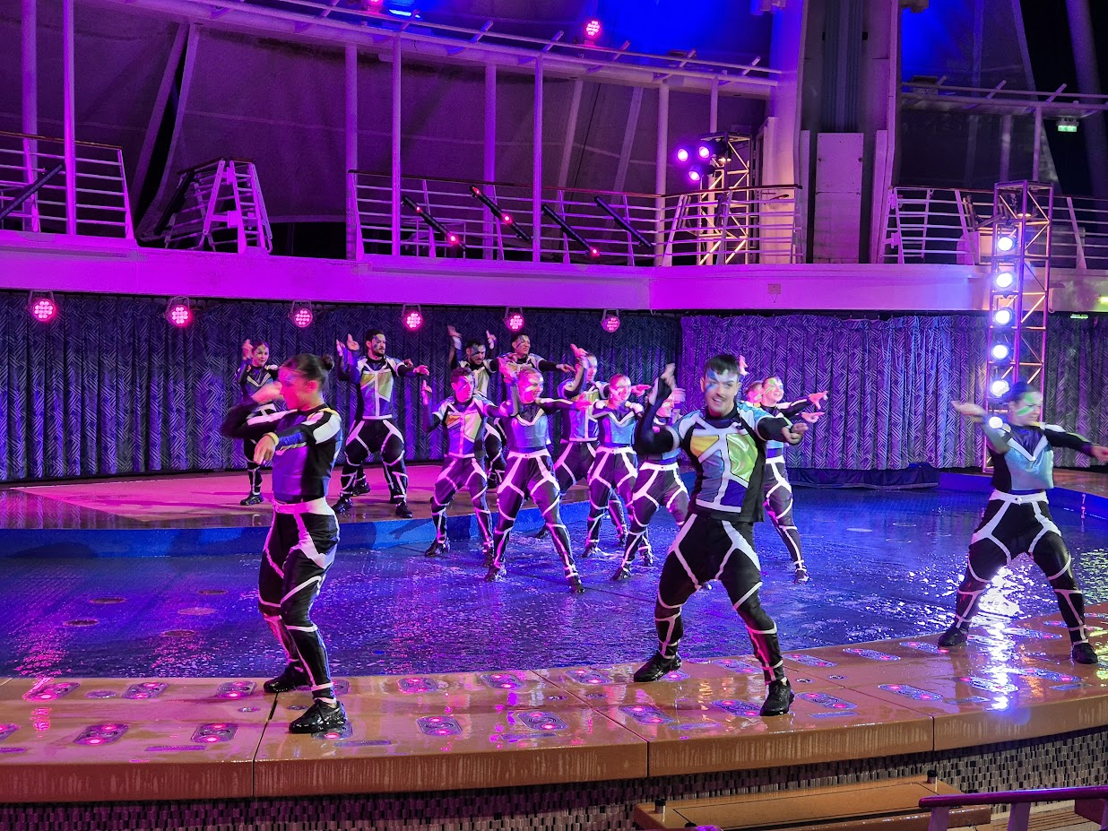 식사 후에는 아쿠아 쇼를 보러 갔습니다. 크루즈에는 (특히 육상 관광을 마치고 돌아오는 저녁 시간에) 여러가지 프로그램이 많이 있습니다. 낮에는 록클라이밍 같은 스포츠 행사가 있고, 저녁에는 주로 공연이나 음악 같은 프로그램이 많습니다. 이러한 쇼는 거의 대부분 무료이고 원하는 때 언제든 가도 되지만, 이 아쿠아 쇼처럼 인기있는 프로그램 같은 경우에는 언제 참석할지를 예약해 두어야 할 수 있습니다.