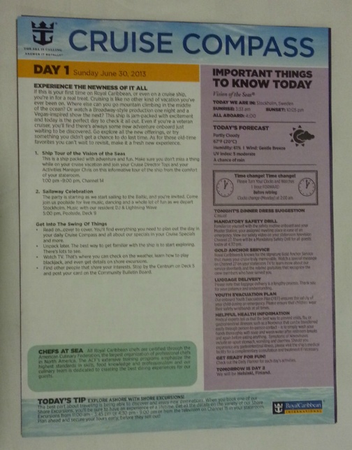 마지막으로 예전 크루즈에서는 이런 종이 팜플렛이 매일 밤 배달되어, 그다음날 있는 행사를 알려줬습니다. 그런데 이것도 로얄 캐리비언 앱에서 해결이 되니 사라졌습니다. 달라고 하면 준다고는 하는데 꼭 필요하진 않아서 받지 않았습니다.