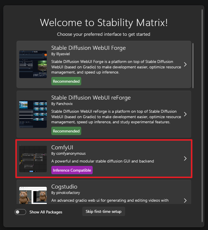 - 쉬운 설치와 갱신 : Stability Matrix 를 사용하면 더이상 복잡한 설치 및 갱신이 필요없게 됩니다. 이 도구는 사용자의 요구의 맞춰 Atutomatic1111, Forge, Fooocus, ComfyUI 등과 같은 다양한 인터페이스를 지원합니다.