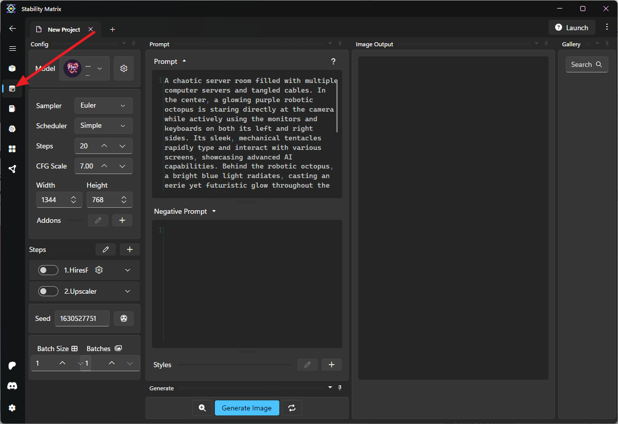 또한, Stability Matrix에는 자체적인 이미지 생성기능이 존재합니다. 좌측 메뉴에서 "Inference" 버튼을 누르고 아래와 같이 적당하게 설정한 뒤, 아래쪽에 있는 "Generate Image" 버튼을 누르면 됩니다.
