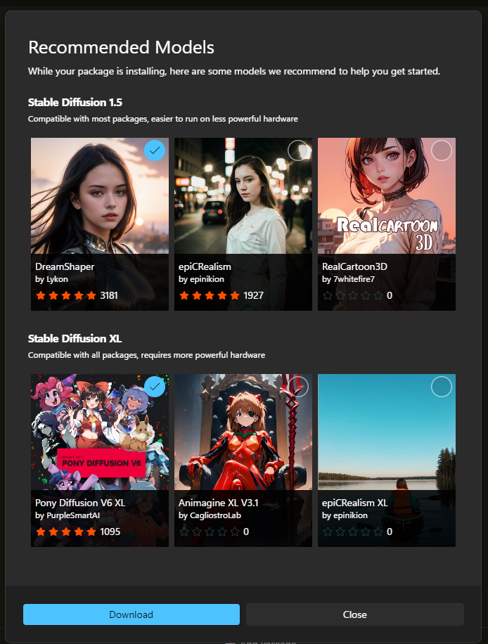 그 다음으로는 아래와 같이 기본 모델을 다운받으라는 화면이 나옵니다. 원하시면 받으셔도 되고, 그냥 "Close"를 눌러도 됩니다.