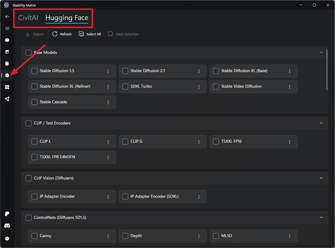 새로운 모델을 설치하고자할 경우에는 먼저 좌측 메뉴에서 "Model Browser"아이콘을 선택한 후 Civitai 또는 Hugging Face를 선택하고 적당히 필터링하여 검색한 후 설치하시면 됩니다.