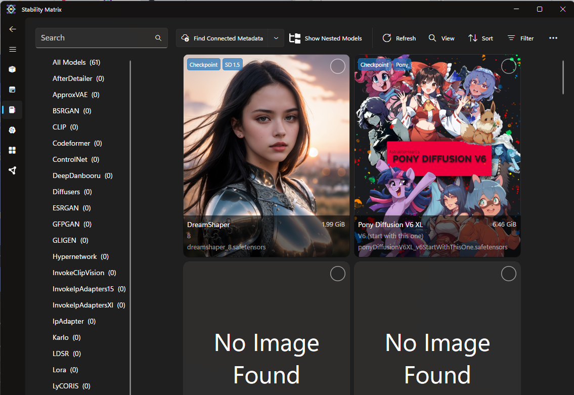 기존에 다운로드받은 체크포인트 모델이 있다면 Data\Models\Stable Diffusion 폴더내에 옮겨주고 Stability Matrix를 재 실행하면 인식됩니다. 이때 옮긴 모델에 관련 이미지가 없을 수 있는데, 아래에서 표시한 "Find Connected Metadata"를 클릭해주면 해당 자료를 Civitai.com 등에서 읽어오게 됩니다.