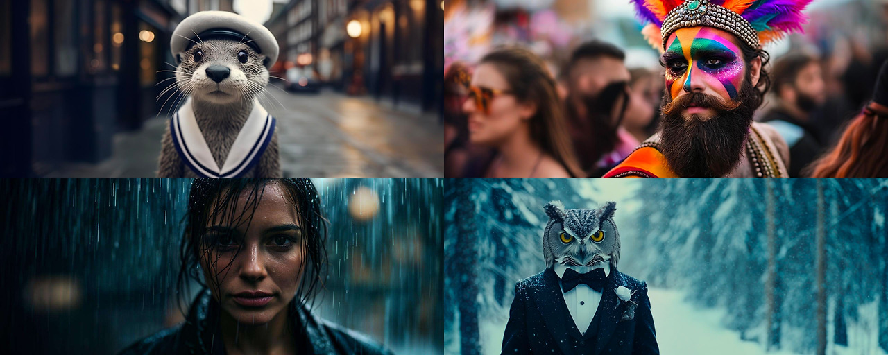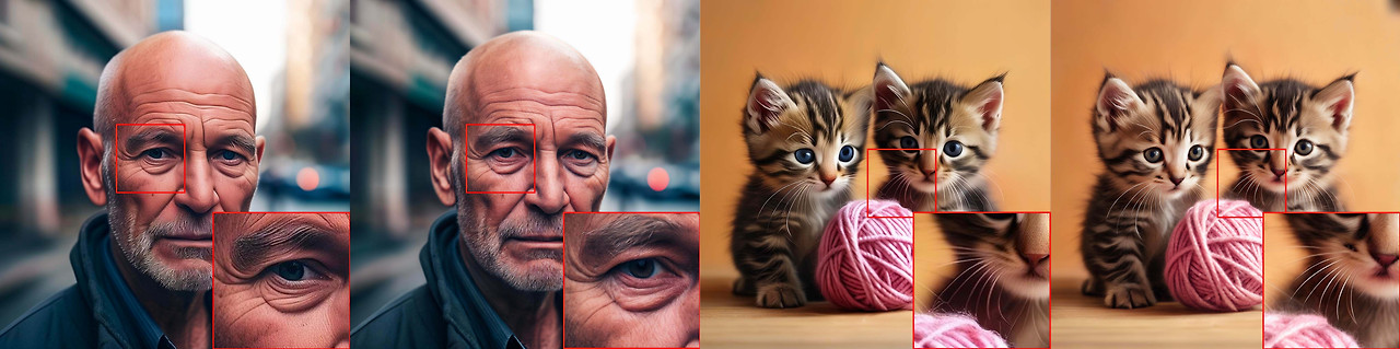 이들 이미지를 4x16x24x24 로 압축 인코딩할 수 있어, 1024/24 =42.67 배의 공간 압축률을 달성할 수 있습니다. 이후, 스테이지 A와 B를 사용하여 해당 이미지들을 다시 4x3x1024x1024로 디코딩하면 아래와 같은 이미지를 얻을 수 있습니다.