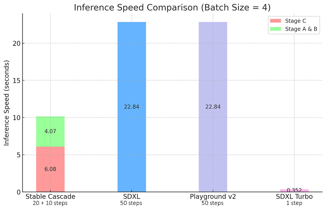 Stable Cascade의 초점은 효율성으로, 아키텍처 및 고압축 잠재 공간을 통해 증명됩니다. 아래의 그림에서 볼 수 있는 것처럼, SDXL 보다도 더 많은 14억개의 매개변수를 포함하는 큰 모델임에도 불구하고, 추론 시간은 더 빠른 것이 특징입니다.