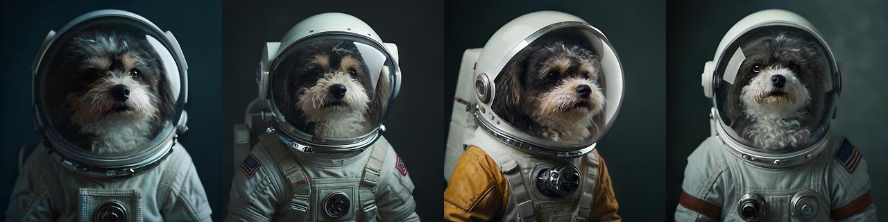 아래는 "Cinematic photo of a dog [fernando] wearing a space suit"라는 프롬프트를 사용하여 우리집 강아지 이미지를 생성한 예입니다.