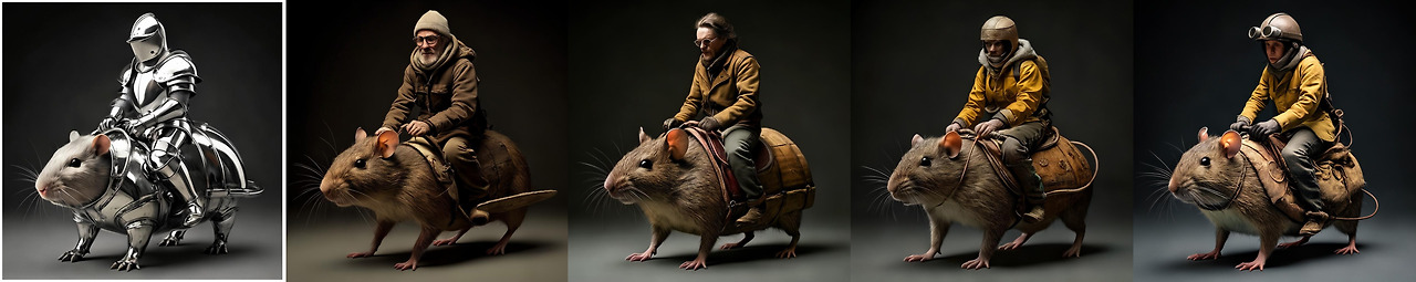 이미지에 특정 지점까지 잡음을 추가한 뒤 모델로 하여금 이미지를 생성하는, 일반적인 방식으로 작동합니다. 아래 맨 좌측은 입력 이미지 이며, 나머지는 80%의 잡음을 추가한 후, 프롬프트를 "A person riding a rodent"로 지정한 결과입니다.