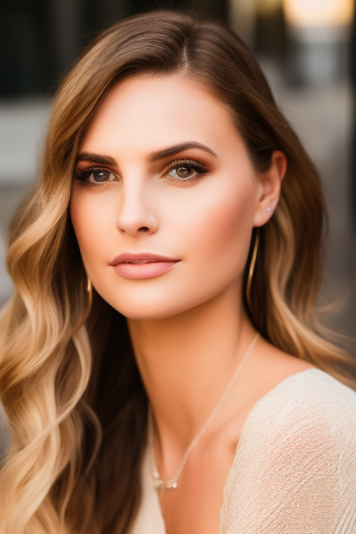 a young lady, brown eys, highlights in hair, smil, wearing stylish business casual attire, sitting outside, quiet city street, rim lighting