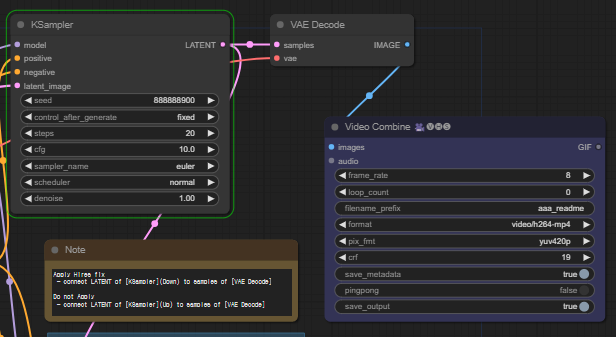 그런데, 현재의 워크플로는 Hires.Fix를 사용하지 않아서 얼굴이 깨집니다. 그러므로 전체적인 구도만 확인한 후, 마음에 들면 아래와 같이 워크플로를 약간 수정시킨 후 새로 돌려주면 품질이 조금 나아진 비디오가 생성됩니다.