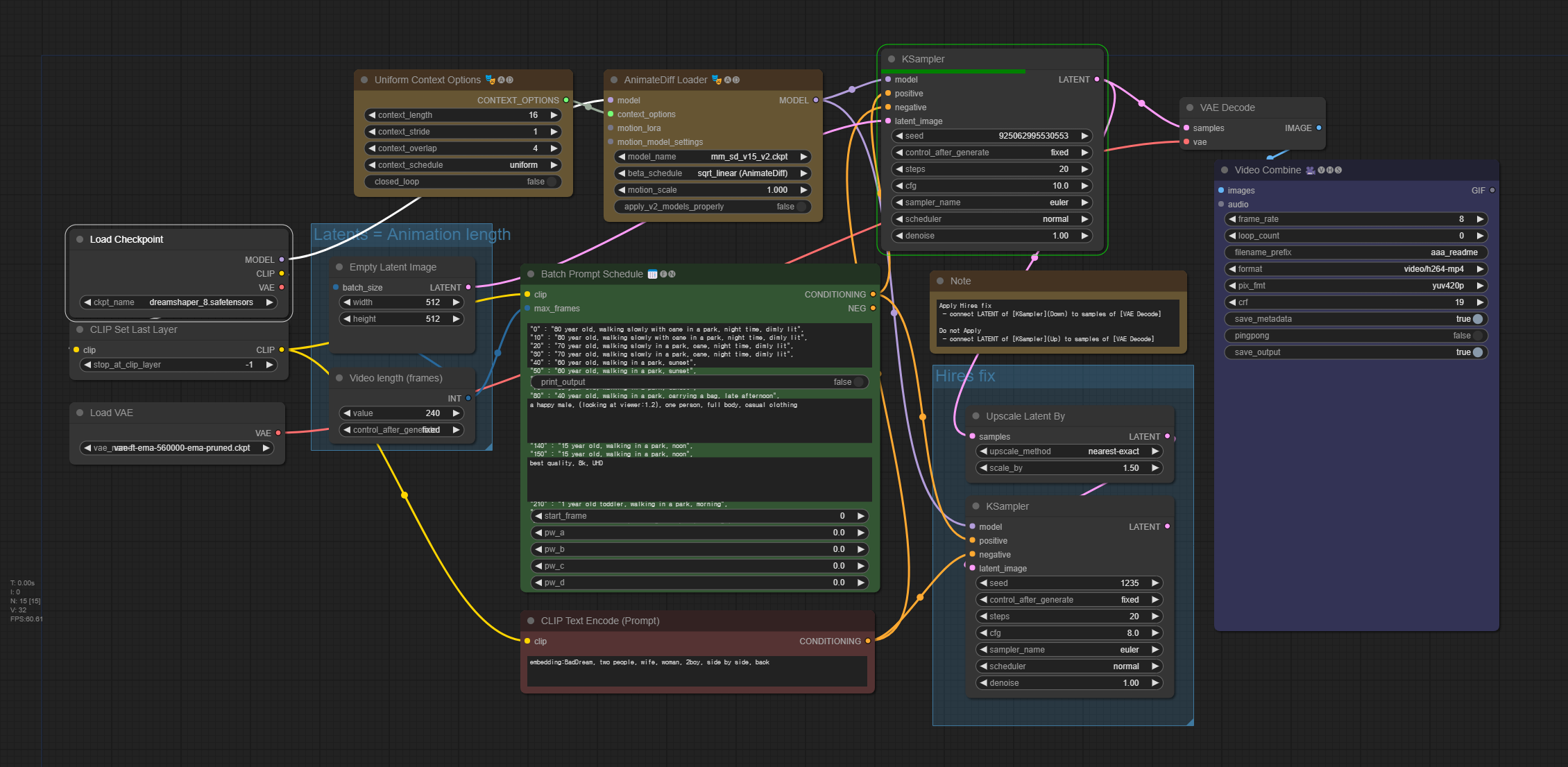 [Queue Prompt] 버튼을 누르면 비디오가 생성되기 시작합니다. 먼저 위쪽에 있는 KSampler 노드에서 각각의 비디오 프레임을 생성하고(3060에서 10분 정도 소요됩니다), 그 다음 이를 결합해서 비디오를 생성합니다.
