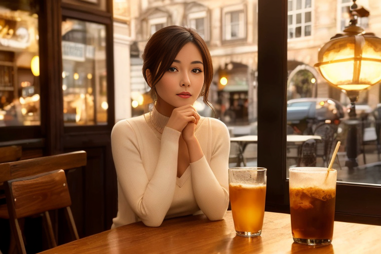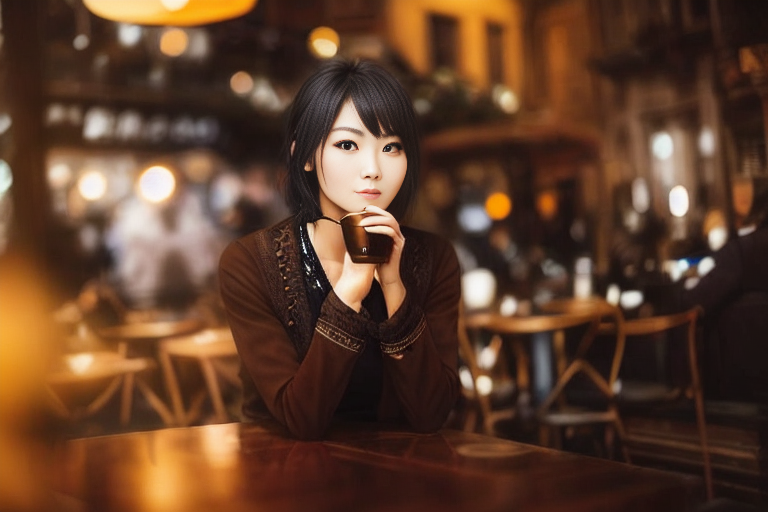 프롬프트 : a beautiful woman sitting at a table, brown eyes, looking at me, atmospheric cafe,