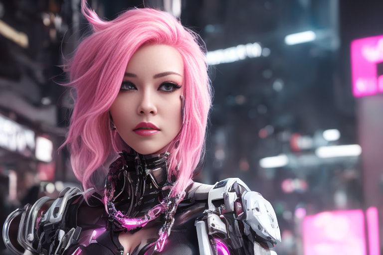 프롬프트: a woman with pink hair and a futuristic suit with chains on her head and a sci - fi filament on her face, Artgerm, cyberpunk style, cyberpunk art, retrofuturism