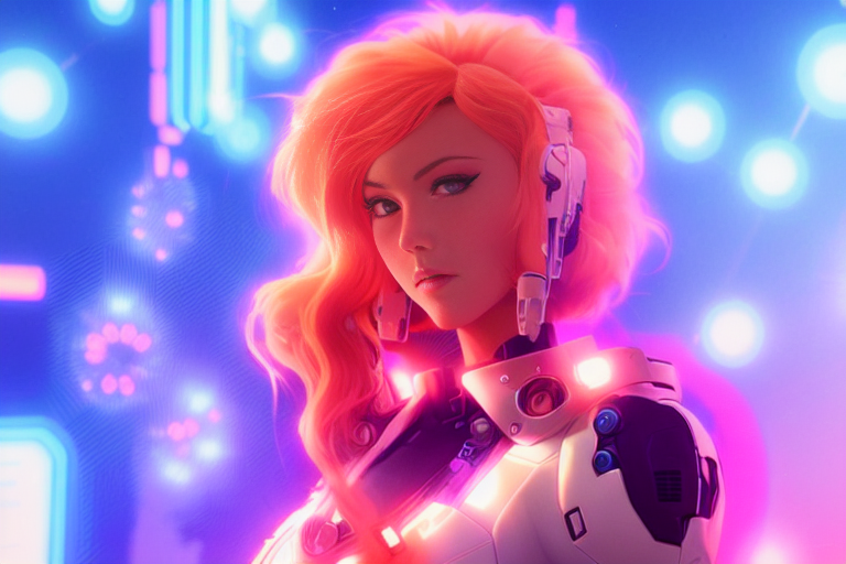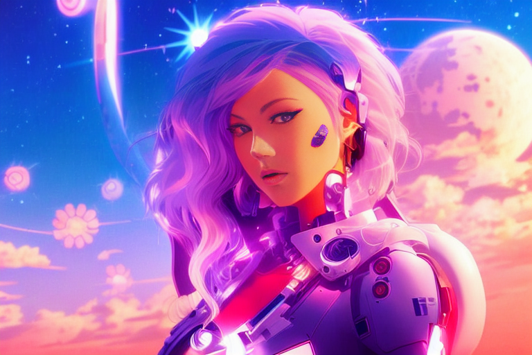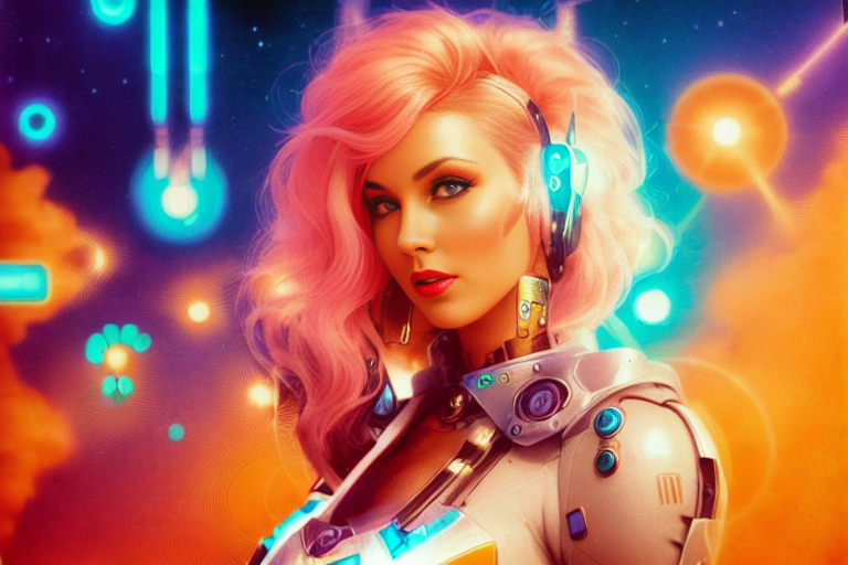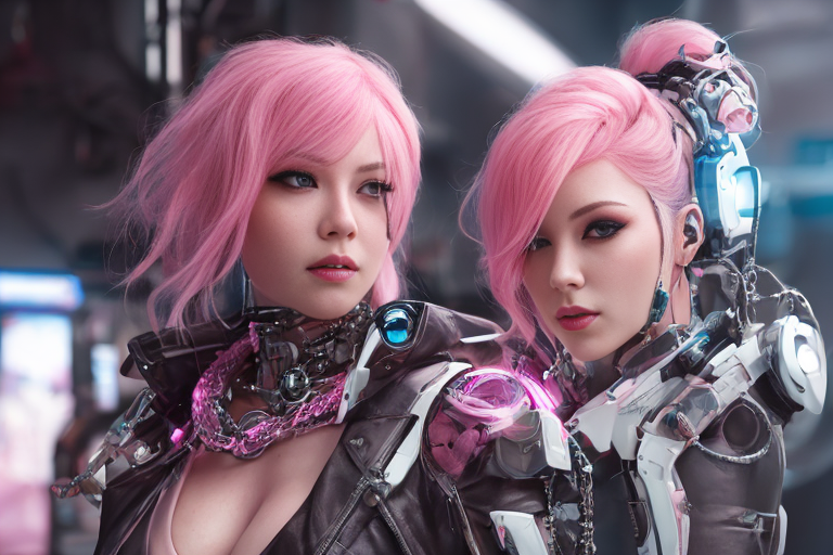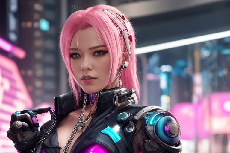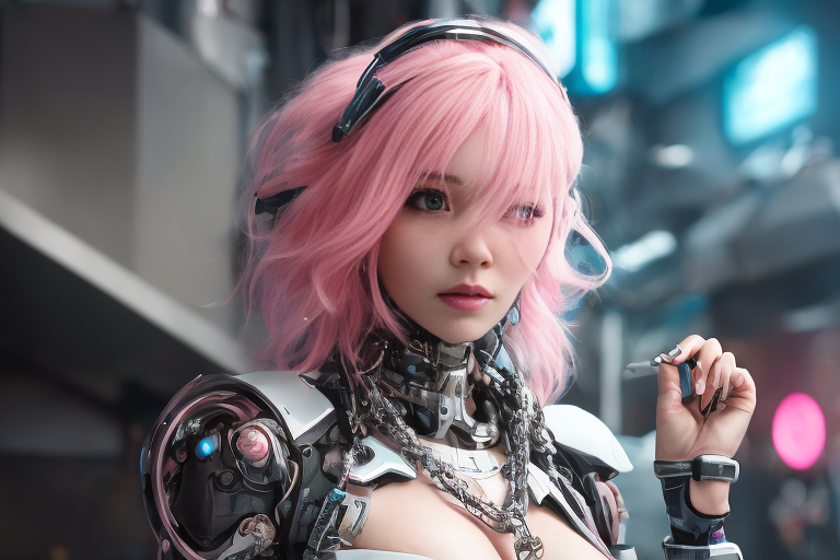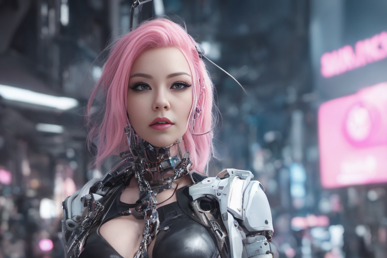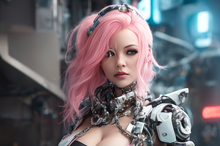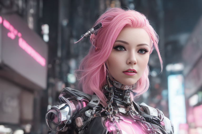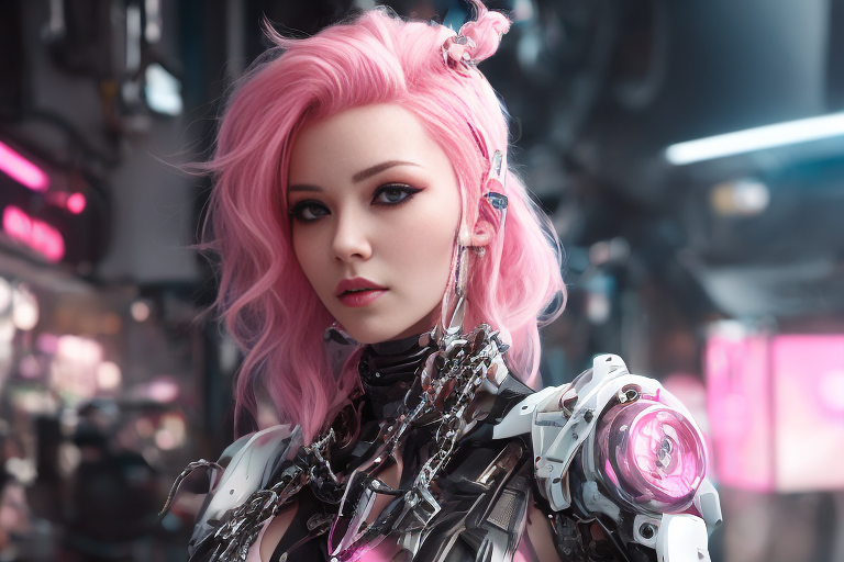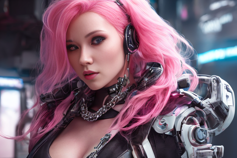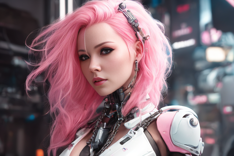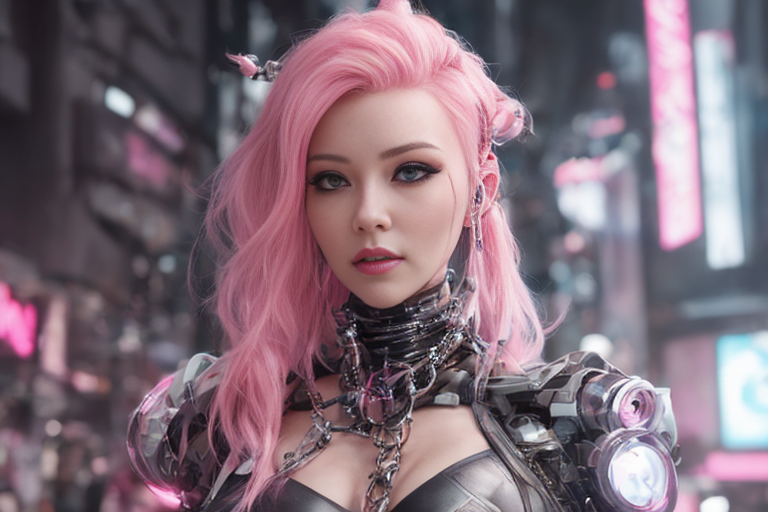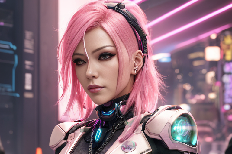 프롬프트: a woman with pink hair and a futuristic suit with chains on her head and a sci - fi filament on her face, Artgerm, cyberpunk style, cyberpunk art, retrofuturism