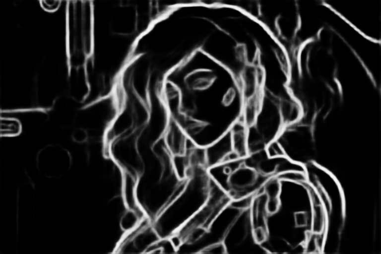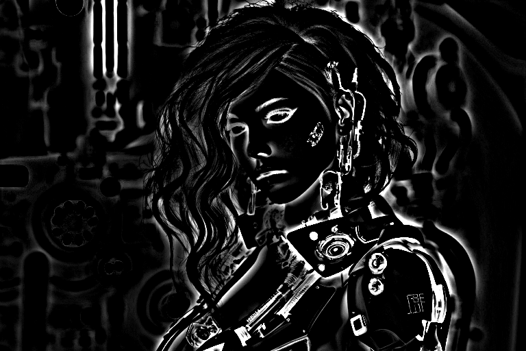 아래는 depth_zoe 전처리기를 적용한 결과입니다. 머리카락이 모두 살아 있습니다. Canny 외곽선 감지기와는 달리 옷의 질감 형태 등은 완전히 달라졌구요. 오른쪽 사진의 경우, 어깨 보호대?가 옷깃으로 살아난 부분이 흥미롭네요.