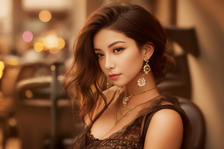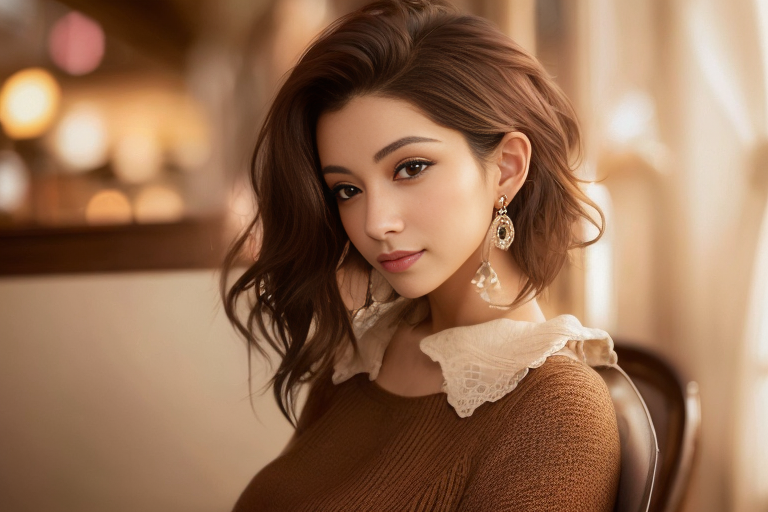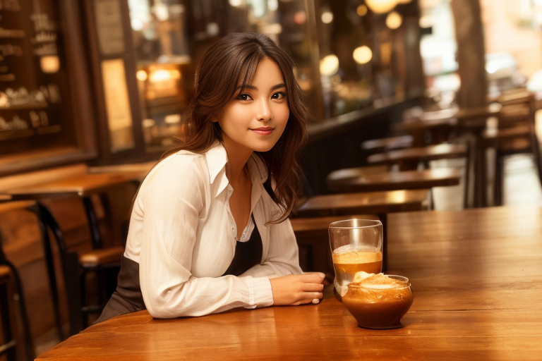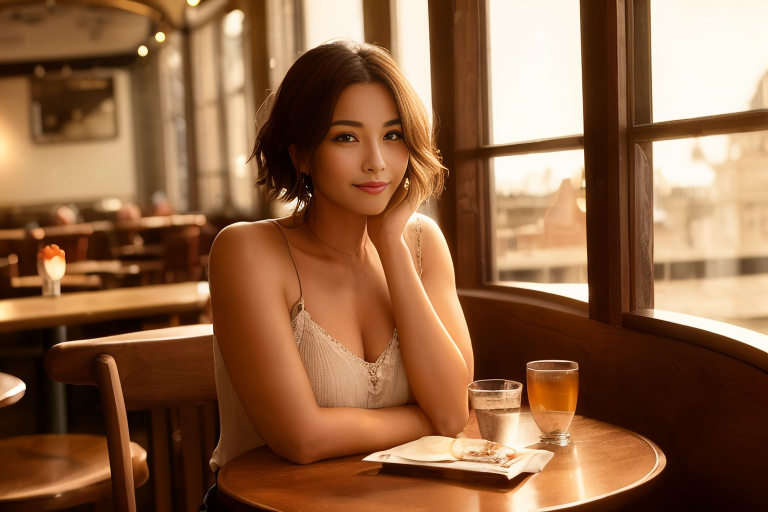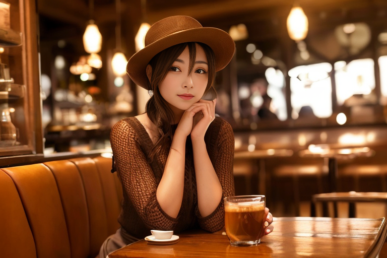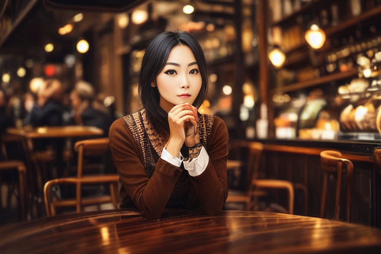 프롬프트 : a beautiful woman sitting at a table, brown eyes, looking at me, atmospheric cafe,