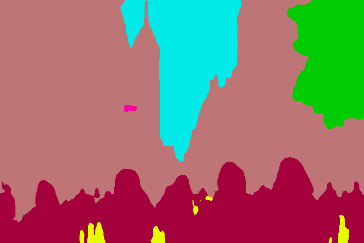 Segmentatin은 이미지에 들어있는 대상의 종류에 따라 다른 색으로 부여하는 기법입니다. 아래 그림에서 보는 것 처럼, 건물, 나무, 사람 등이 각각 다른 색깔로 분류되어 있습니다. ufade20k 와 ofade20k의 경우, 어떤 분류가 어떤 색으로 표현되는지는 여기 Color map을 보면 알 수 있습니다. COCO 세그멘트이션(ofcoco)의 color map은 다르다고 합니다.