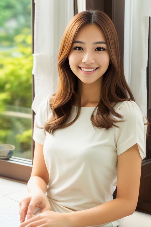 프롬프트 : half-body, a beautiful woman, brown eyes, sitting beside windows, smile, small breast