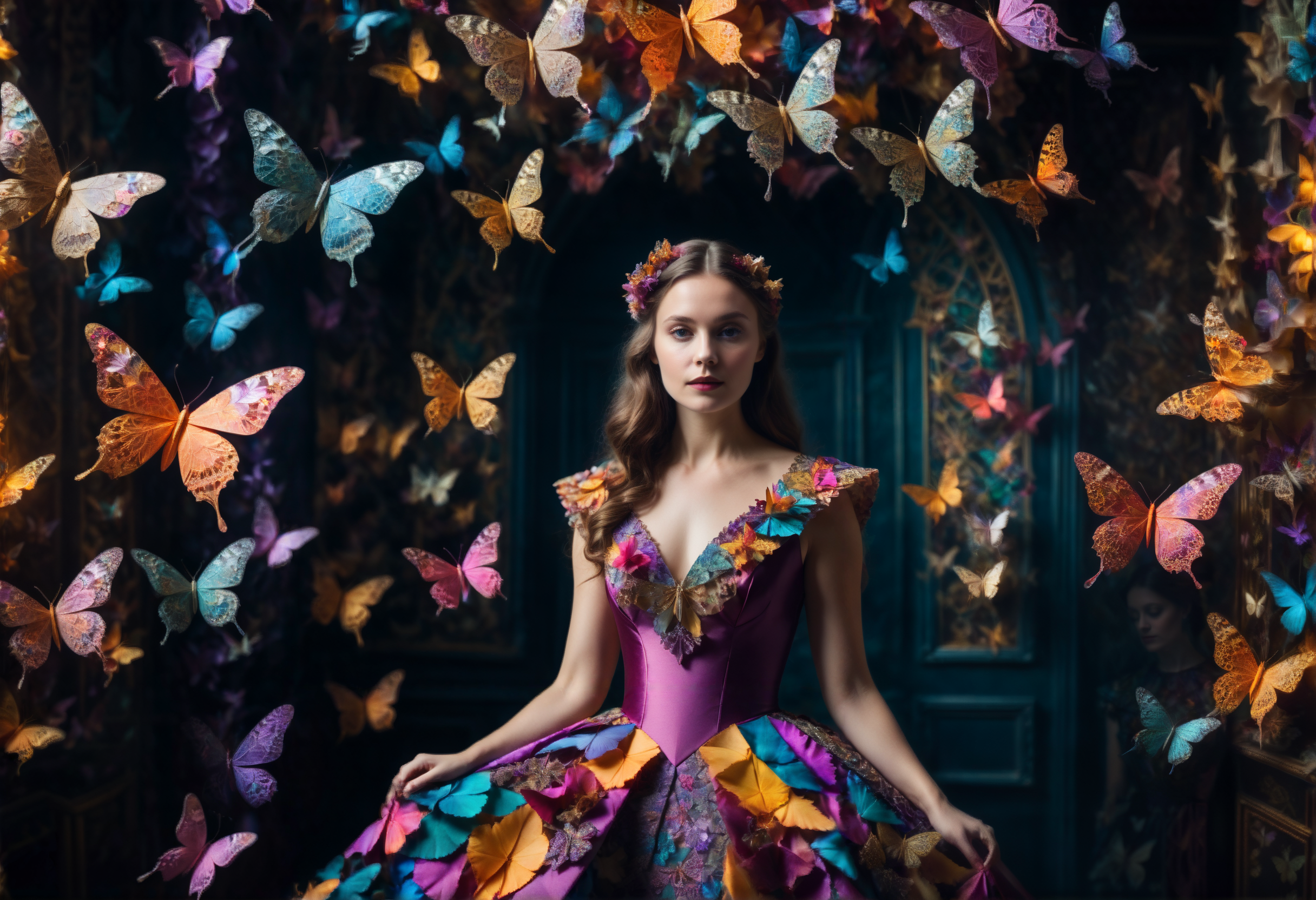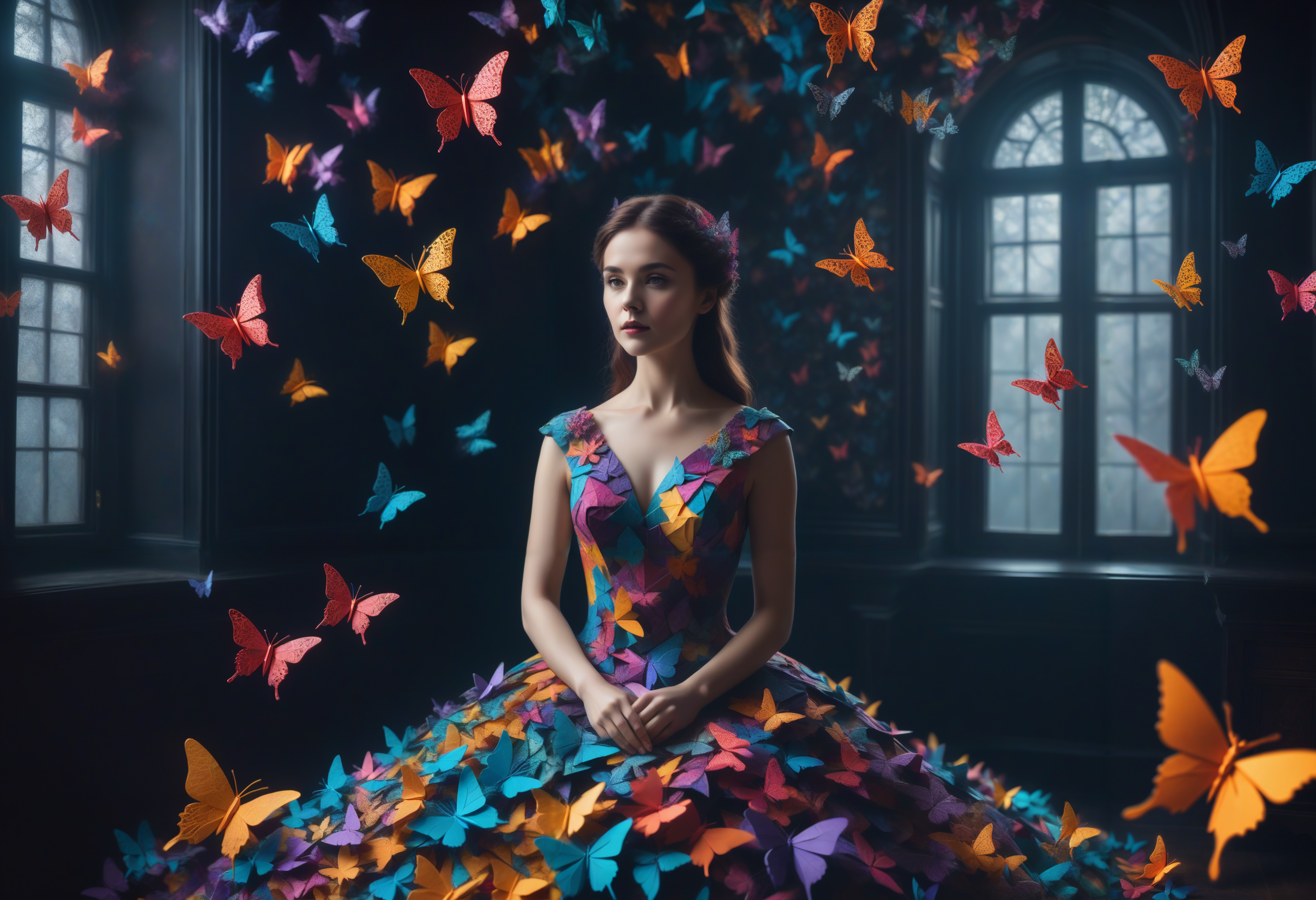 프롬프트: a woman in a colorful dress made of artistic chaotic origami surrounded by butterflies, fractal, dreamlike magic realism, look away, dark studio, dimly lit victorian room <lora:offset_0.2:1> <lora:add-detail-xl:1> <lora:xl_more_art-full_v1:0.5>