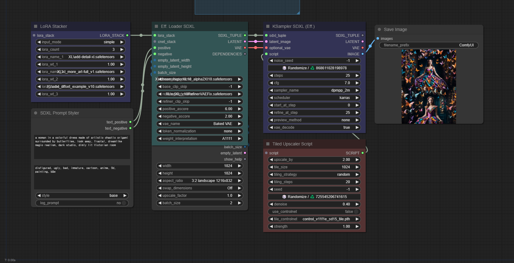 아래는 이상의 내용을 가능한 한 반영하여 작성한 워크플로입니다. 제가 자주 사용하는 Efficiency 커스톰 노드를 기반으로한 SDXL 이미지용 워크플로를 확장한 것입니다. LoRA의 가중치와 프롬프트를 약간 변경했고, UpScaler는 Efficient 커스톰 노드에 포함된 Tiled Upscaler Script를 사용했습니다.