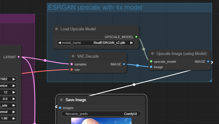 Upscale 에서 가장 중요한 부분은 아래와 같습니다. [KSampler] 노드에서 생성된 잠재 이미지를 [VAE Decoder]를 통하면 일반 이미지가 되는데, 이를 [Upscale Image] 노드를 통해 확대합니다. 이때 AI확대 모델은 [Load Upscale Model] 노드를 통해 R-ESRGAN 을 사용했습니다.