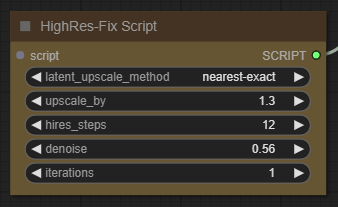 여기에서 가장 중요한 것은 아래 [HighRes-Fix Script] 노드입니다. 잠재 이미지를 1.3배 키우고 12 단계를 수행하라는 등으로 설정되어 있습니다.