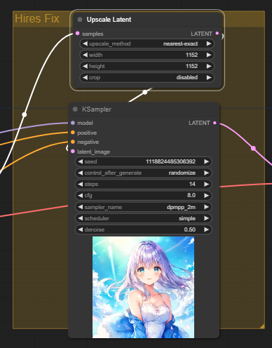 아래가 Hires Fix의 가장 핵심 부분으로서, 위에서 생성된 잠재 이미지를 [UpScale Latent] 노드를 사용해 크기를 키우고, 이를 KSampler의 latent-image 입력 슬롯에 공급하여, 다시 한번 잡음 제거 샘플링을 수행하는 방식임을 아실 수 있을 것입니다.