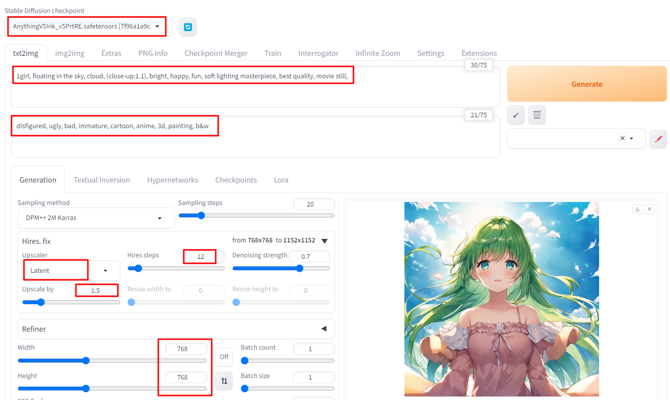 AUTOMATIC1111에서 이 기법을 적용하려면, 먼저 txt2img에서 이미지를 생성하면서 HiRes Fix를 지정하면 됩니다. 대략 아래와 같이 설정합니다. 이 설정은 위의 ComfyUI의 설정값과 가능한 한 유사하게 설정했습니다. txt2img 설정은 아래와 같습니다.