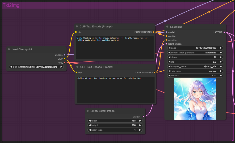 보라색에 있는 워크플로는 ComfyUI를 한번이라도 사용해 봤다면 구지 설명할 필요가 없을 정도로 매우 익숙한 기본 Txt2img 워크플로입니다.