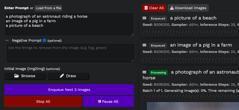 - 프롬프트에 여러 줄(Return으로 분리)을 입력하면, 각 줄별로 따로 따로 실행됩니다. 예를 들어, 세 줄로 입력하면 아래와 같이 세개의 대기열이 만들어집니다.