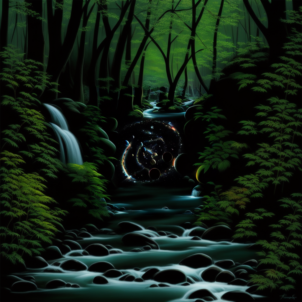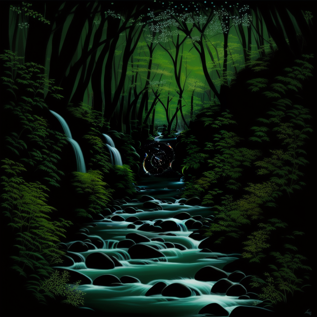 프롬프트: A crystal-clear brook babbling through an enchanged forest waking up from winter, the first blossoms of spring adorning the trees, Magical, life-filled, highly detailed digital painting inspired by the art of Eyvind Earle. vibrant and naturalistic colors.