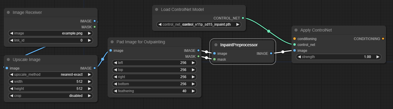 이제 위에서 만든 노드들과 아래와 같이 연결해 줍니다. [Pad Image for Outpainting] 노드와 [InpaintPreprocessor] 노드를 링크로 연결해 주면 됩니다.