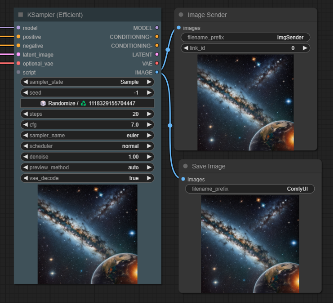 가장 중요한 노드 중 하나는 생성된 이미지를 다시 입력 이미지로 사용할 수 있도록 해주는 [Image Sender] 노드와 [Image Receiver] 노드입니다. [Ksampler (Efficient)]노드에는 아래와 같이 [Image Sender] 노드를 연결해줍니다.