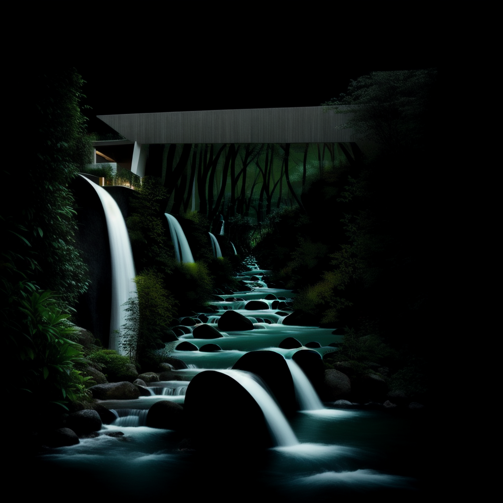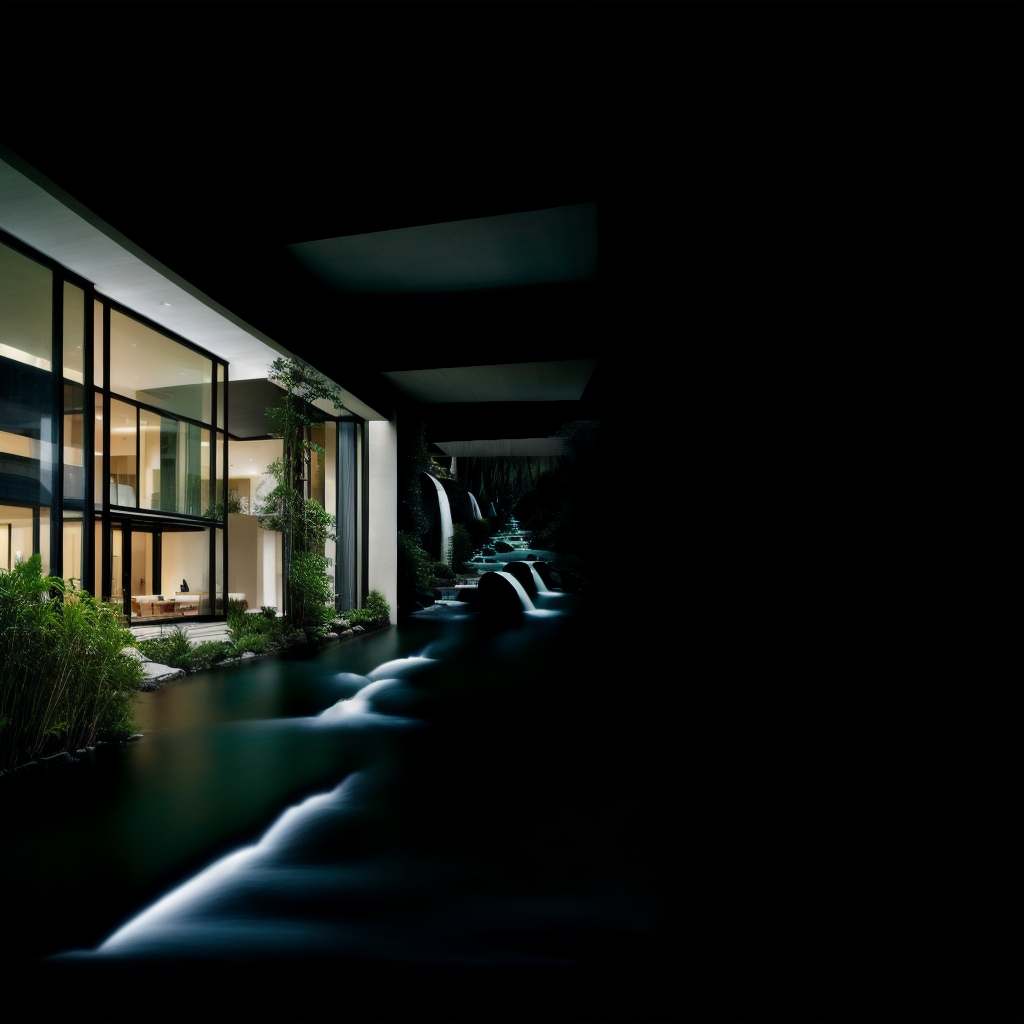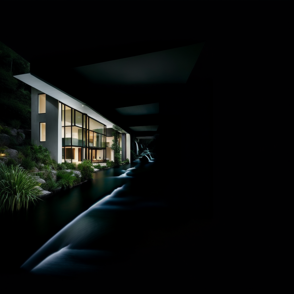 프롬프트: An architectural marvle of a modern house built into a hillside, surrounded by a meticulously landscaped garden with flowing water featuers. Innovative, sleek, serene. Photorealistic digital art in the style of Santiago Calatrava. Highly detailed, harmonious colors.