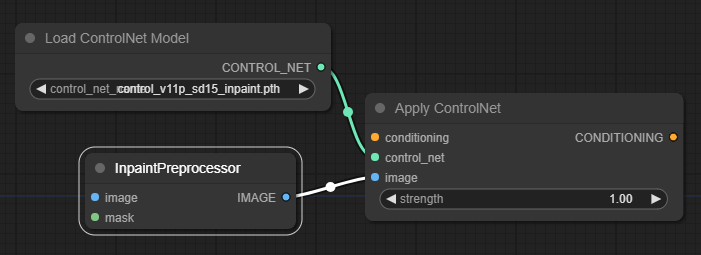 물론 이렇게 채워진 바깥쪽은 그냥 까만색 이미지일 뿐이죠. 여기를 채워넣어야 합니다. 채워넣는 것은 ControlNet Inpaint 모델을 사용합니다. 아래와 같이 세가지 노드를 추가하고 아래 그림과 같이 연결해줍니다. 여기에서 [Load ControlNet Model] 노드에는 "control_v11p_sd15_inpaint.pth"를 불러오도록 설정해 줍니다.