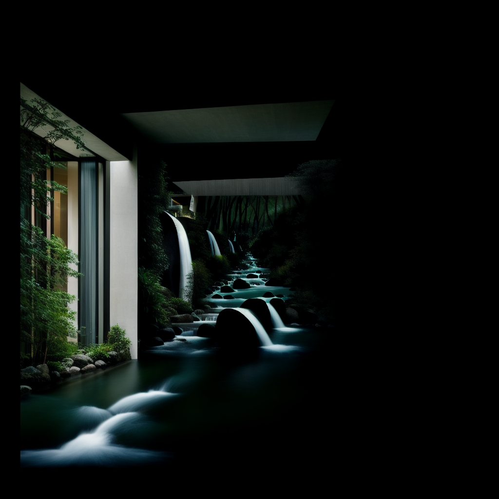 프롬프트: An architectural marvle of a modern house built into a hillside, surrounded by a meticulously landscaped garden with flowing water featuers. Innovative, sleek, serene. Photorealistic digital art in the style of Santiago Calatrava. Highly detailed, harmonious colors.
