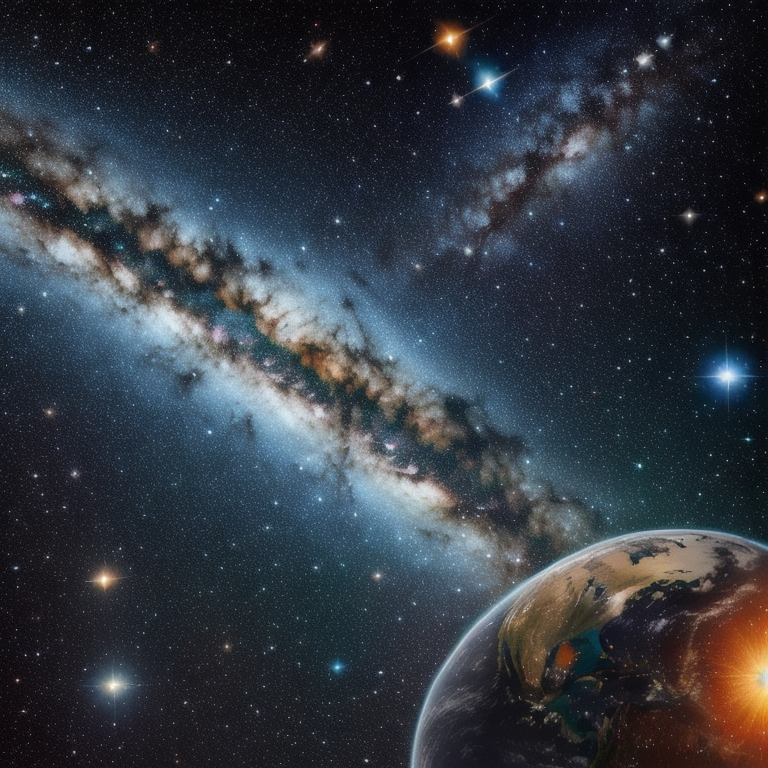 프롬프트: A stunning cosmic scene featuring the Earth, the Moon, and the Milkyway galaxy. Earth and its satellite shimer brightly against the backdrop of a star-filed galaxy. Majestic, celetial, intricate. Digital art inspired by the work of Nasa, 8K UHD, highly detailed. radiant colors