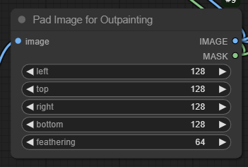 여기에서 [Pad Image for Outpainting] 노드에서는 left/top/right/bottom을 각각 256씩으로 설정해주고, feathering, 즉 이미지가 서로 섞이게 하는 범위를 128 정도로 넓혀줍니다.