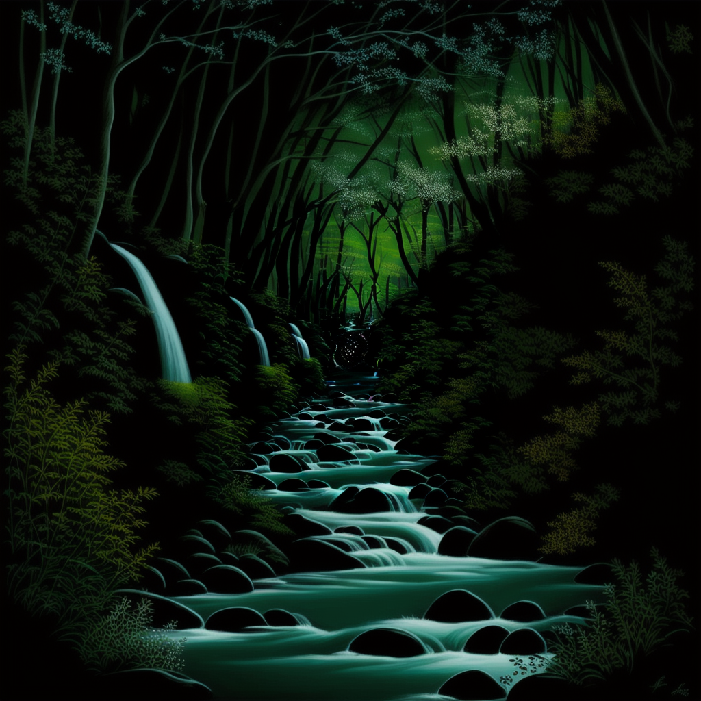 프롬프트: A crystal-clear brook babbling through an enchanged forest waking up from winter, the first blossoms of spring adorning the trees, Magical, life-filled, highly detailed digital painting inspired by the art of Eyvind Earle. vibrant and naturalistic colors.