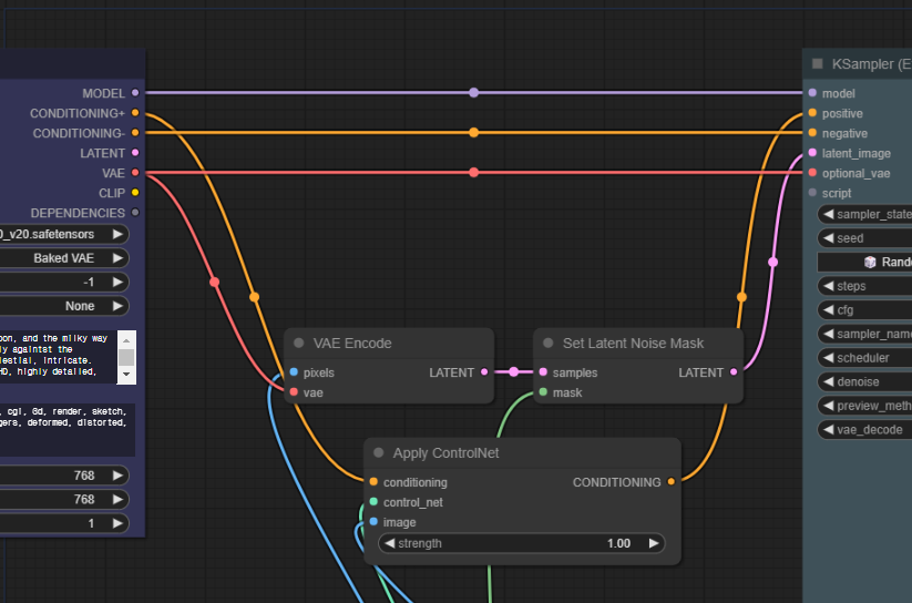 - [Apply ControlNet] 노드의 CONDITIONING 출력슬롯 - [KSampler(Efficient)]노드의 positive 입력슬롯