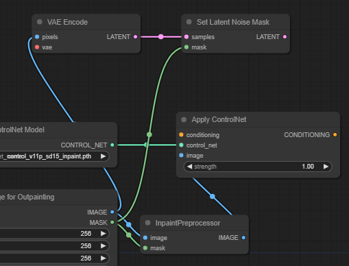 물론 이렇게 채워진 바깥쪽은 그냥 까만색 이미지일 뿐이죠. 여기를 채워넣어야 합니다. 채워넣는 것은 ControlNet Inpaint 모델을 사용합니다. 아래와 같이 세가지 노드를 추가하고 아래 그림과 같이 연결해줍니다. 여기에서 [Load ControlNet Model] 노드에는 "control_v11p_sd15_inpaint.pth"를 불러오도록 설정해 줍니다.