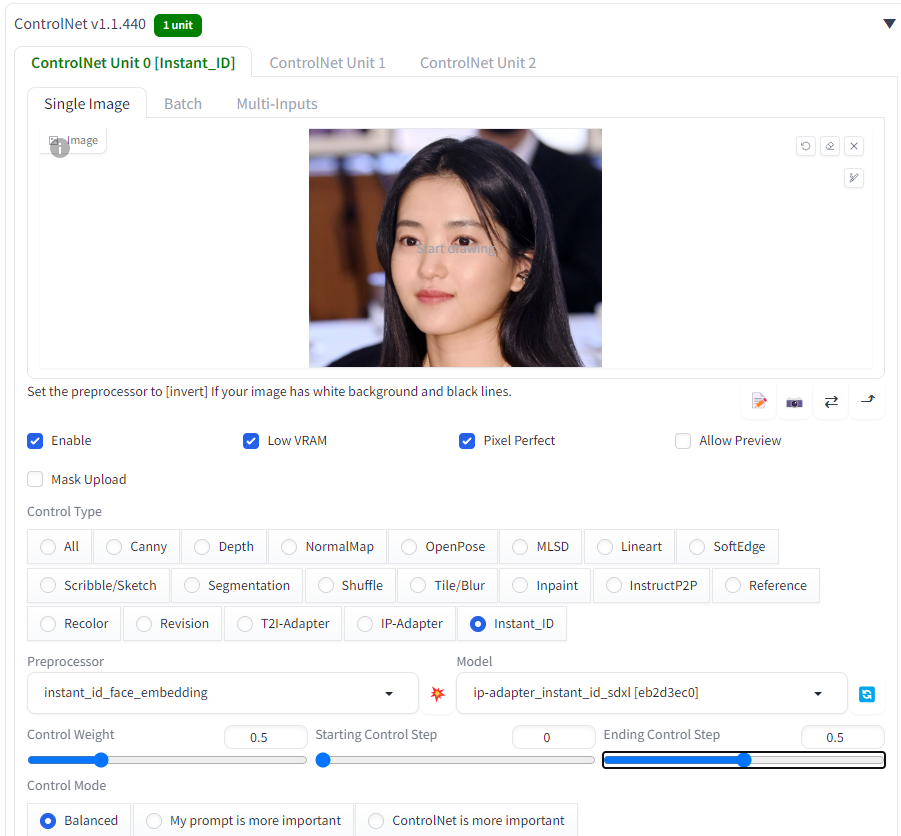 ControlType이나 Preprocessor/Model에서 Instant_ID가 나타나지 않을 경우, 콘트롤넷 확장이 최신 버전이 아닐 수 있습니다. 여기를 보고 업데이트하시기 바랍니다.