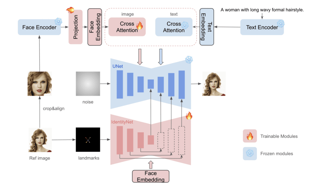 InstantID는 InsightFace를 사용해 참조 이미지로부터 얼굴 임베딩(face embedding)을 감지하고, 잘라내고 추출한 뒤, 이 임베딩을 IP-adapter와 함께 사용하여 이미지 생성을 제어합니다. 여기까지는 IP-Adapter Face ID와 비슷합니다.
