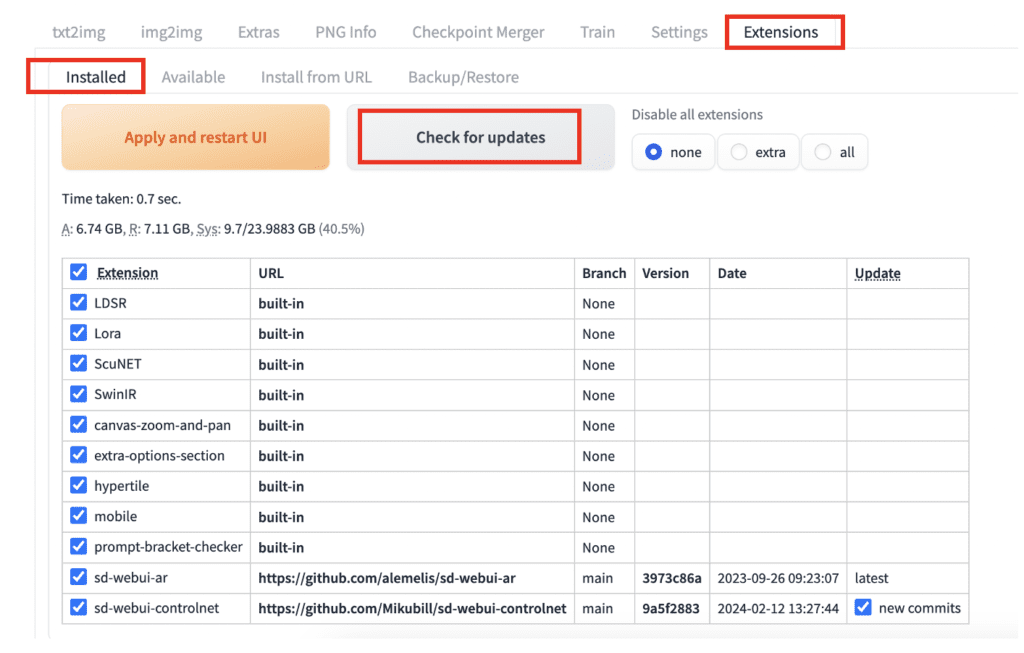 ControlNet을 설치한지 오래되었을 경우, 업데이트가 필요할 수 있습니다. 먼저 Extension 페이지로 들어가 Intalled 탭에서 [Check for updates] 버튼을 누릅니다.