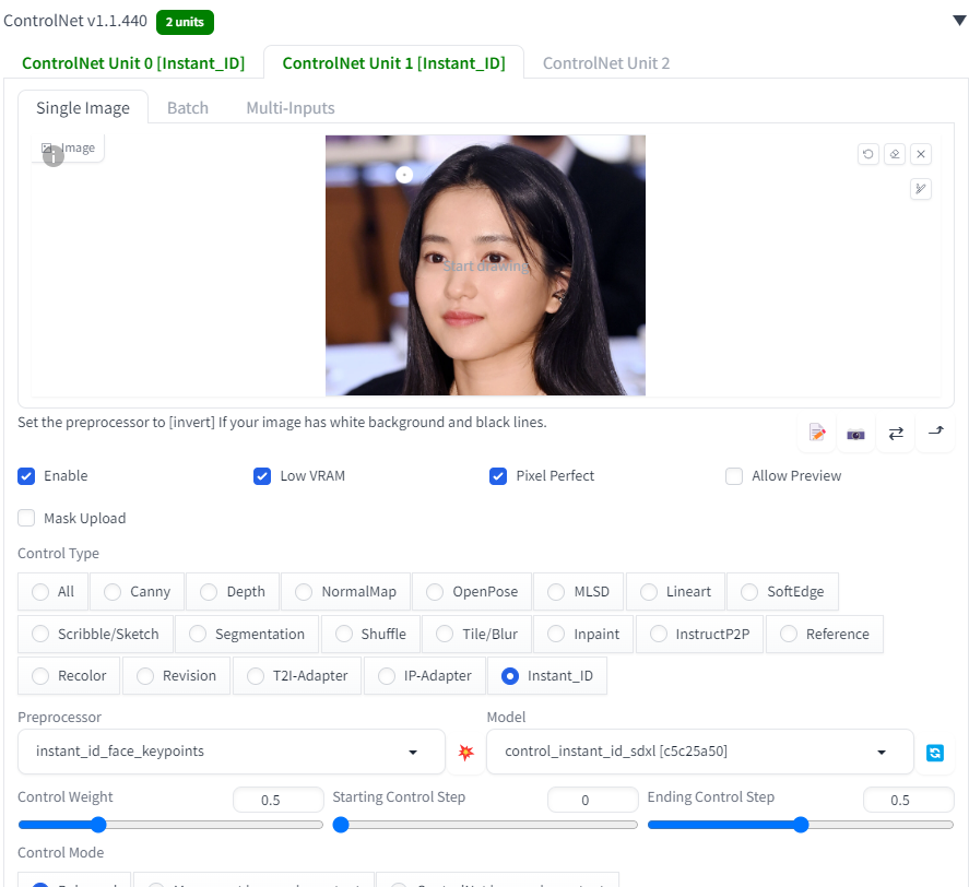 ControlNet 0 에 들어가는 이미지는 얼굴의 특징을 설정하고, 두번째는 얼굴의 키 포인트를 잡아냅니다. 따라서 두 이미지를 달리할 수도 있습니다.